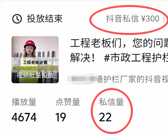 3.人设视频拍完之后,直接拍产品营销视频去投流。结果她的询盘成本被她降到了15块钱左右一个。